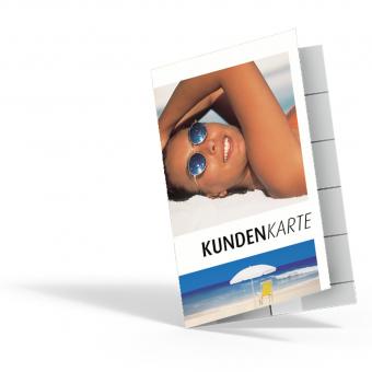 Format geschlossen 55 x 85 mm, Scheckkartenformat!, 215 g Karton, Außenseite mehrfarbig bedruckt und hochglanzlackiert, Innenseite 1-farbig schwarz. Mit Stempelfeld für Ihren Firmenstempel.