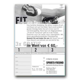 Format 148 x 105 mm, 265 g Karton, hochglanzlackiert, Vorderseite farbig bedruckt, Rückseite einfarbig schwarz,