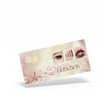 Im Wickelfalz 210 x 100 mm (offen 210 x 240 mm) mit Stecklasche gefertigt, kein Kuvert notwendig. Alle Gutscheine mit hochglanzlackierter Außenseite aus 275 g Postkartenkarton, beidseitig 4-farbig bedruckt. Großes Feld für Ihren Firmenstempel.
