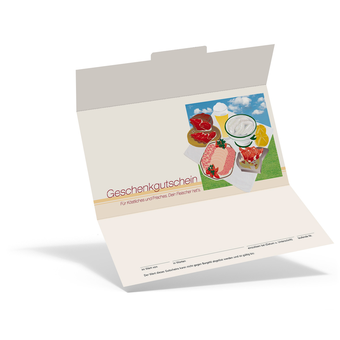 Im Wickelfalz 210 x 100 mm (offen 210 x 240 mm) mit Stecklasche gefertigt, kein Kuvert notwendig. Alle Gutscheine mit hochglanzlackierter Außenseite aus 275 g Postkartenkarton, beidseitig 4-farbig bedruckt. Großes Feld für Ihren Firmenstempel.