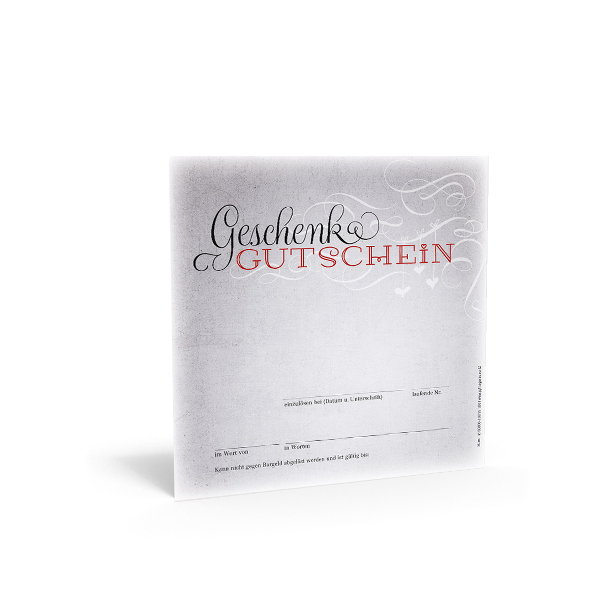 Sie können den Gutschein auch nach Ihren Vorstellungen umgestalten. In diesem Fall kommen zu den Firmenaufdruckskosten einmalig € 79,– an Gestaltungskosten hinzu.