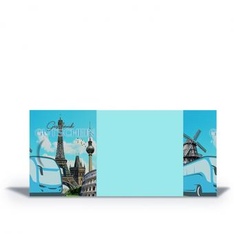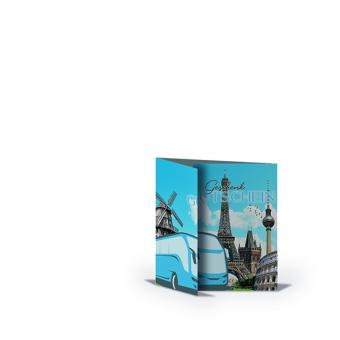 Format geöffnet 218 x 99 mm (geschlossen 99 x 99 mm), aus 275 g Postkartenkarton, hochglanzlackierte Außenseite, beidseitig 4-farbig bedruckt. Großes Feld für Ihren Firmenstempel.