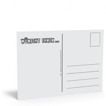 Format 148 x 105 mm, 275 g Postkartenkarton, Vorderseite farbig bedruckt und hochglanzlackiert, Rückseite einfarbig schwarz.